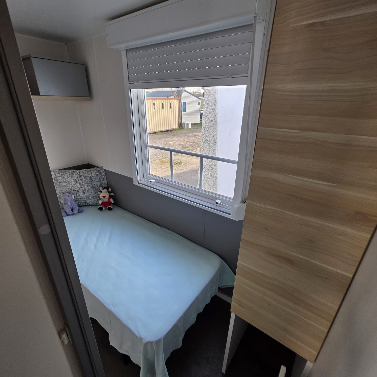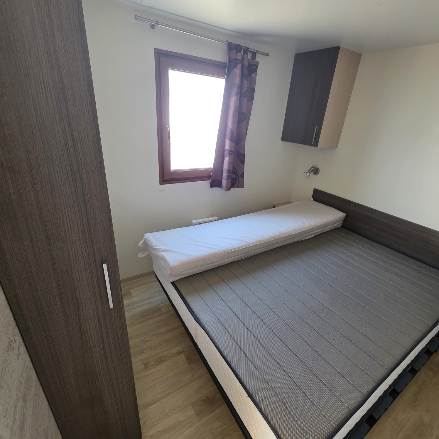 - Dormitorio principal con cama de 1,35m, armario de puertas correderas y altillos para almacenaje.