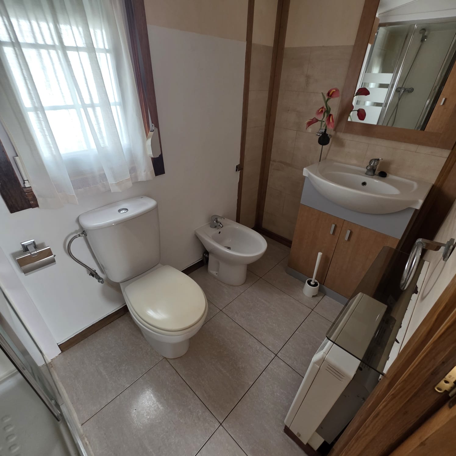 - Baño con mueble de lavabo, calefactor y ducha con mampara.