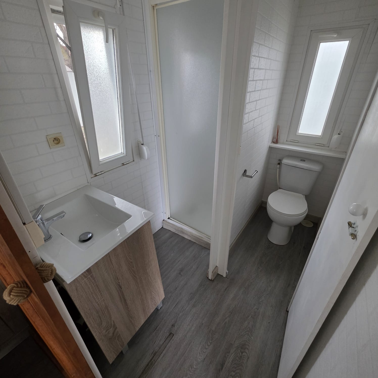 - Baño con WC integrado con puerta, mueble de lavab y ducha con mampara.