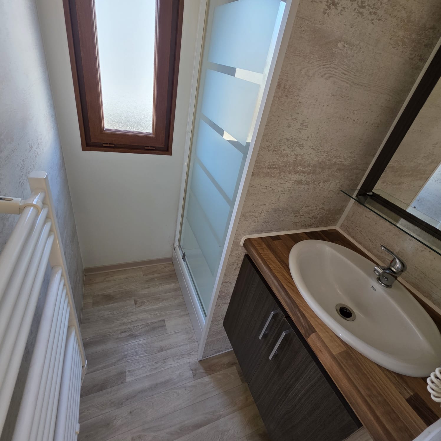 - Baño con mueble de lavabo, toallero calefactor y ducha con mampara.