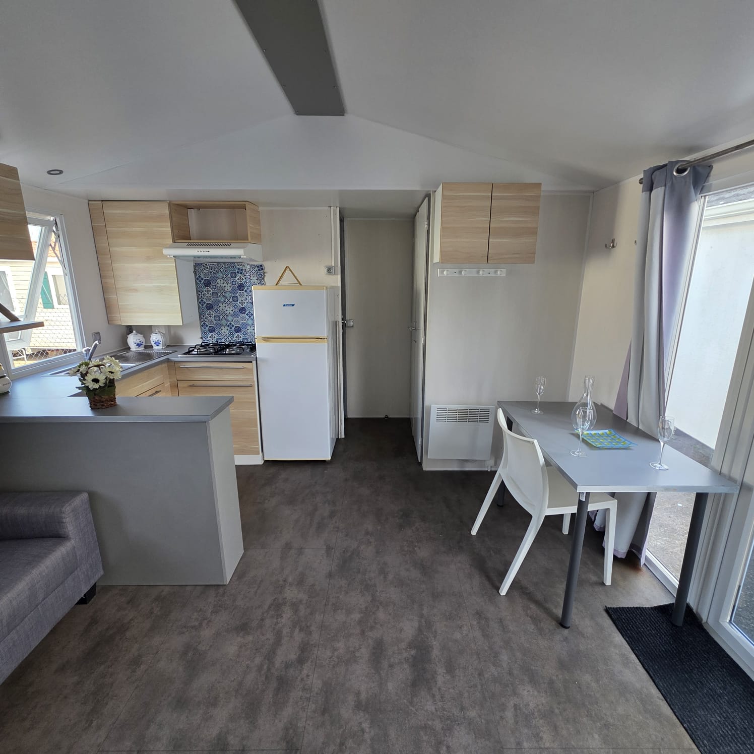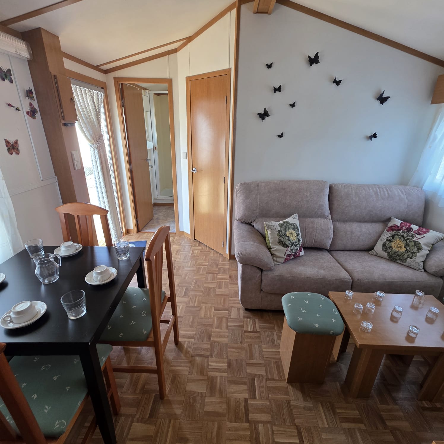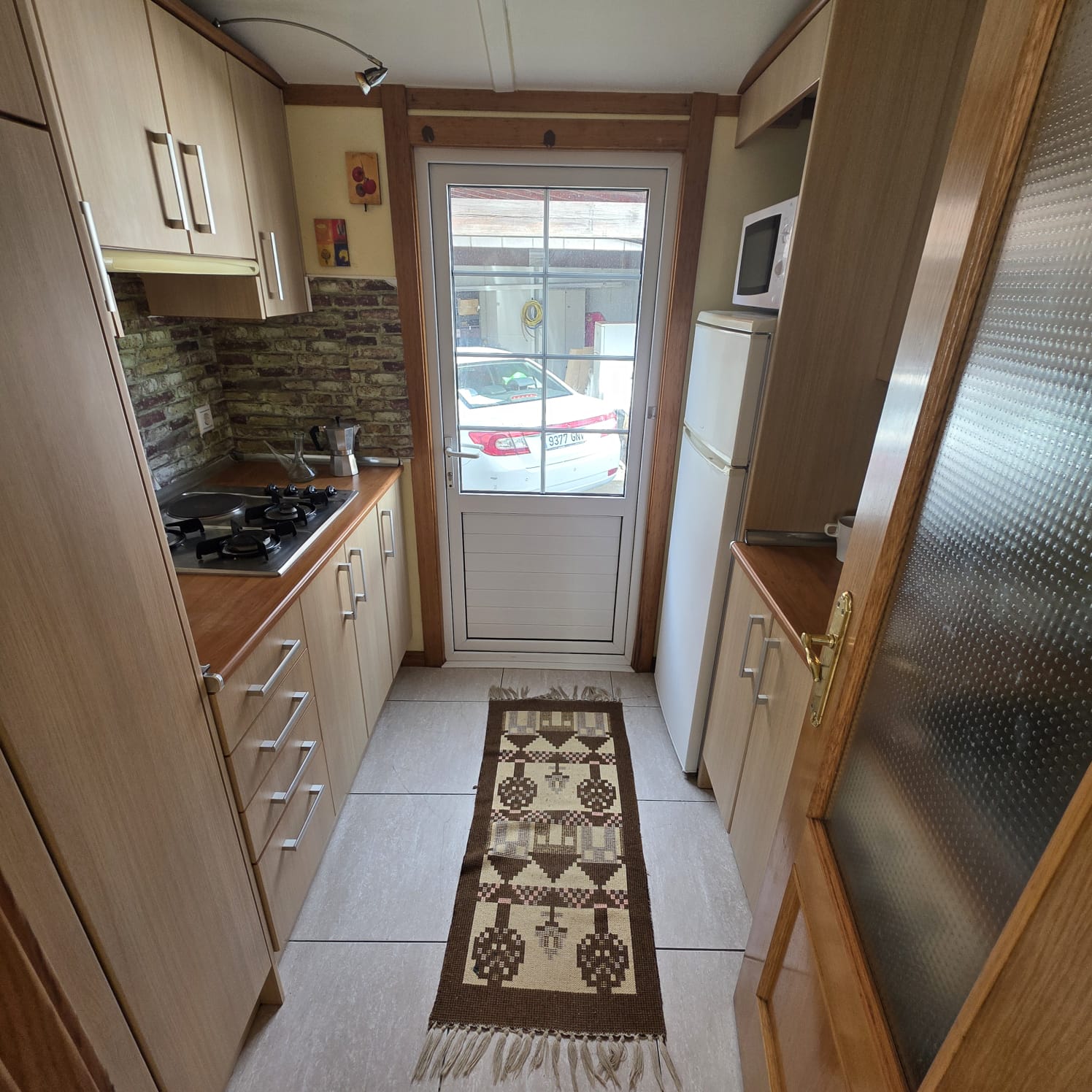- Puerta principal de cristal y ventanal doble de acceso a la cocina.