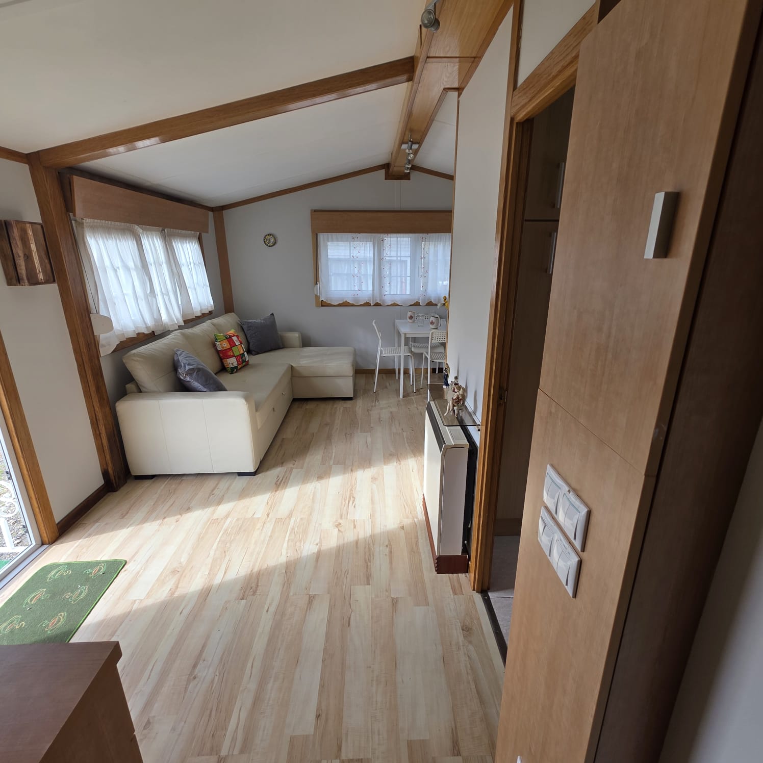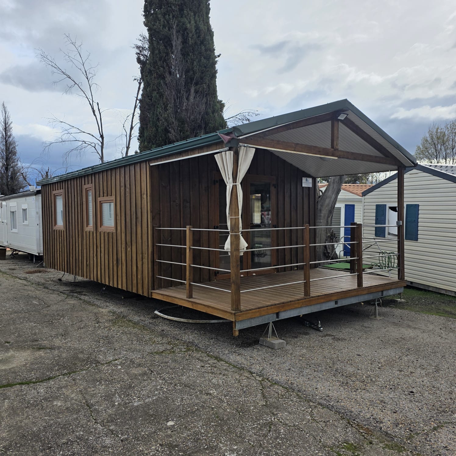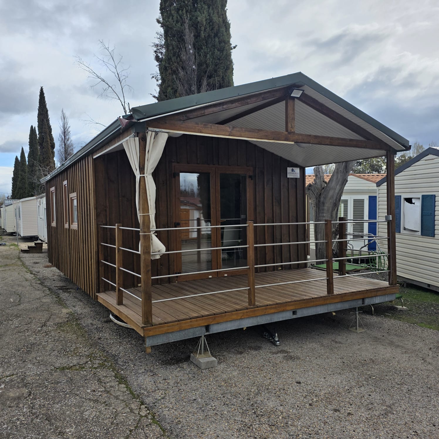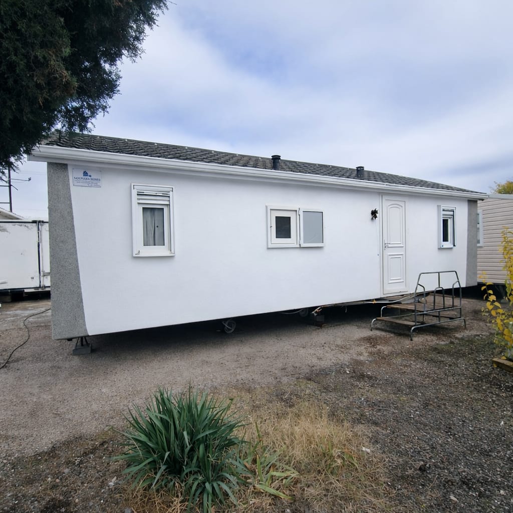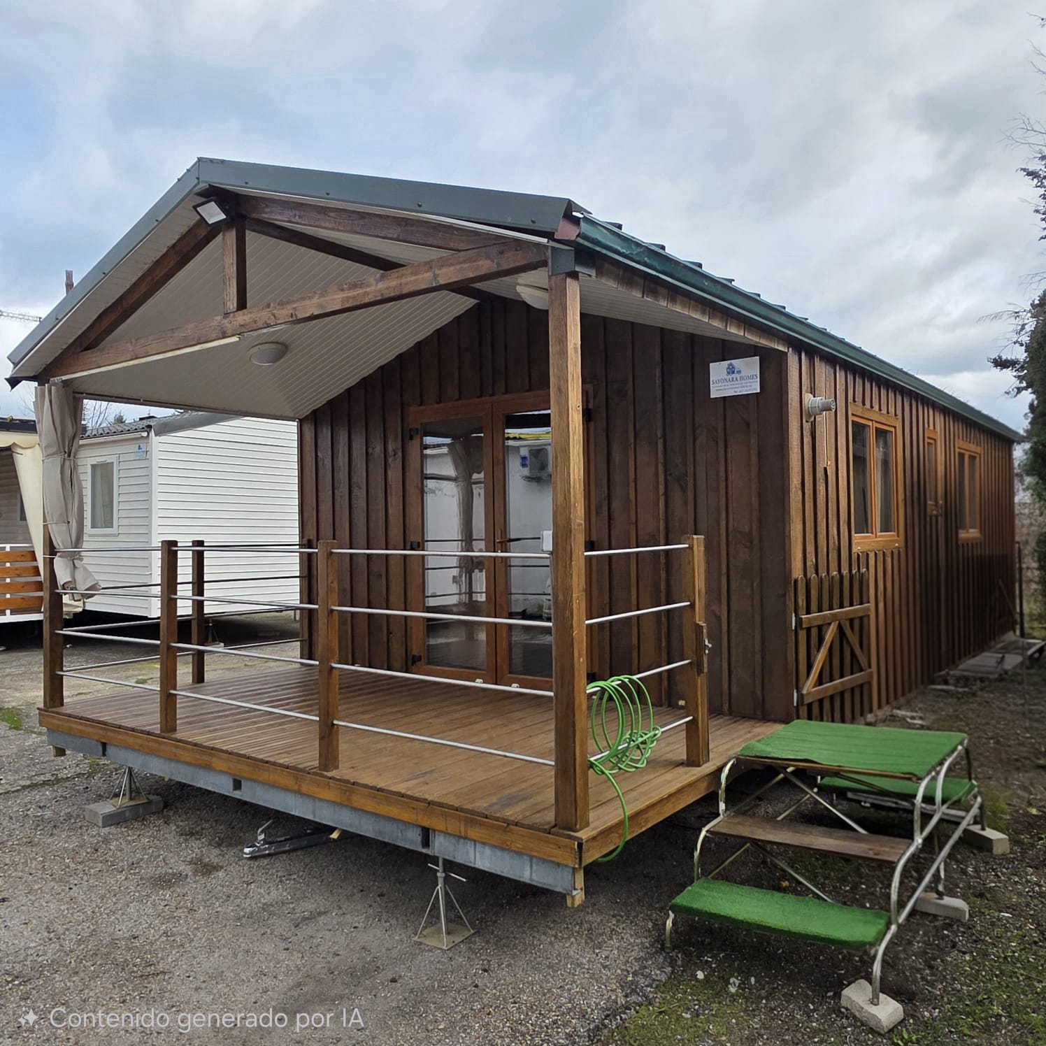 - Fachada exterior en panel sandwich de 60mm de espesor y acabado en vinilo imitación madera (SIN MANTENIMIENTO).
