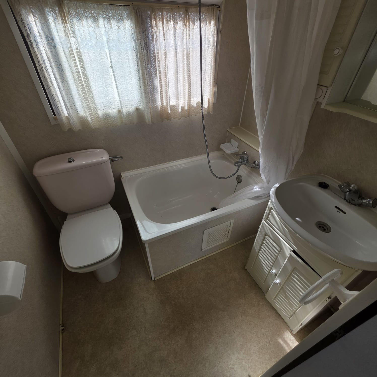 - Baño con media bañera, WC y lavabo con mueble..