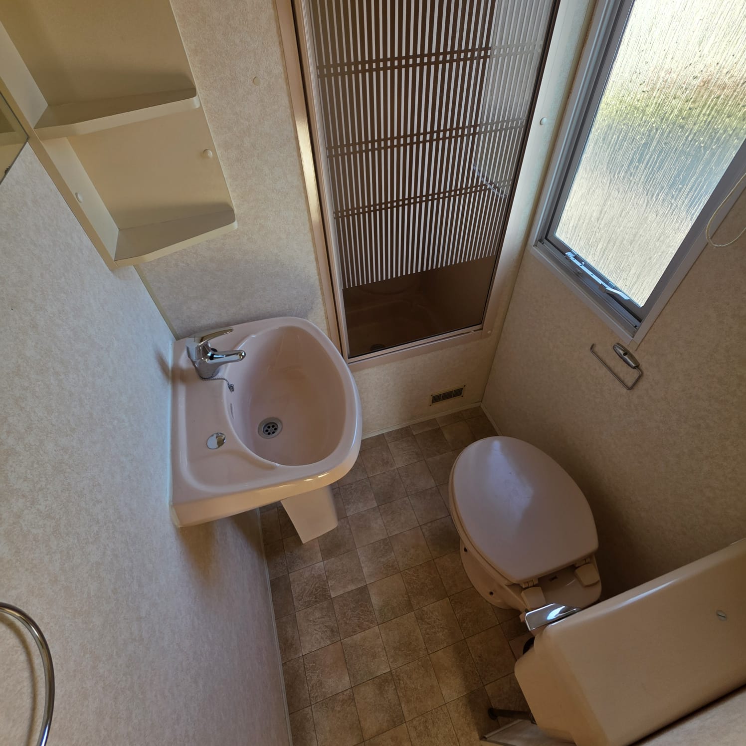 - Baño con plato de ducha con mampara.