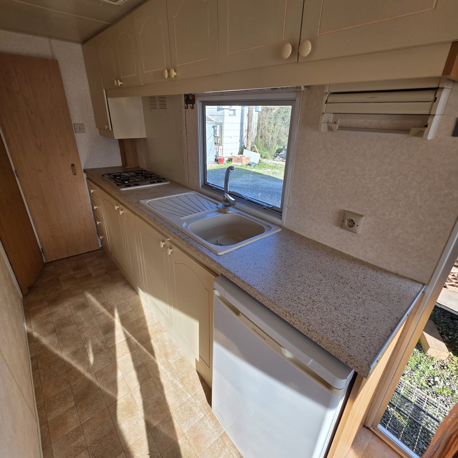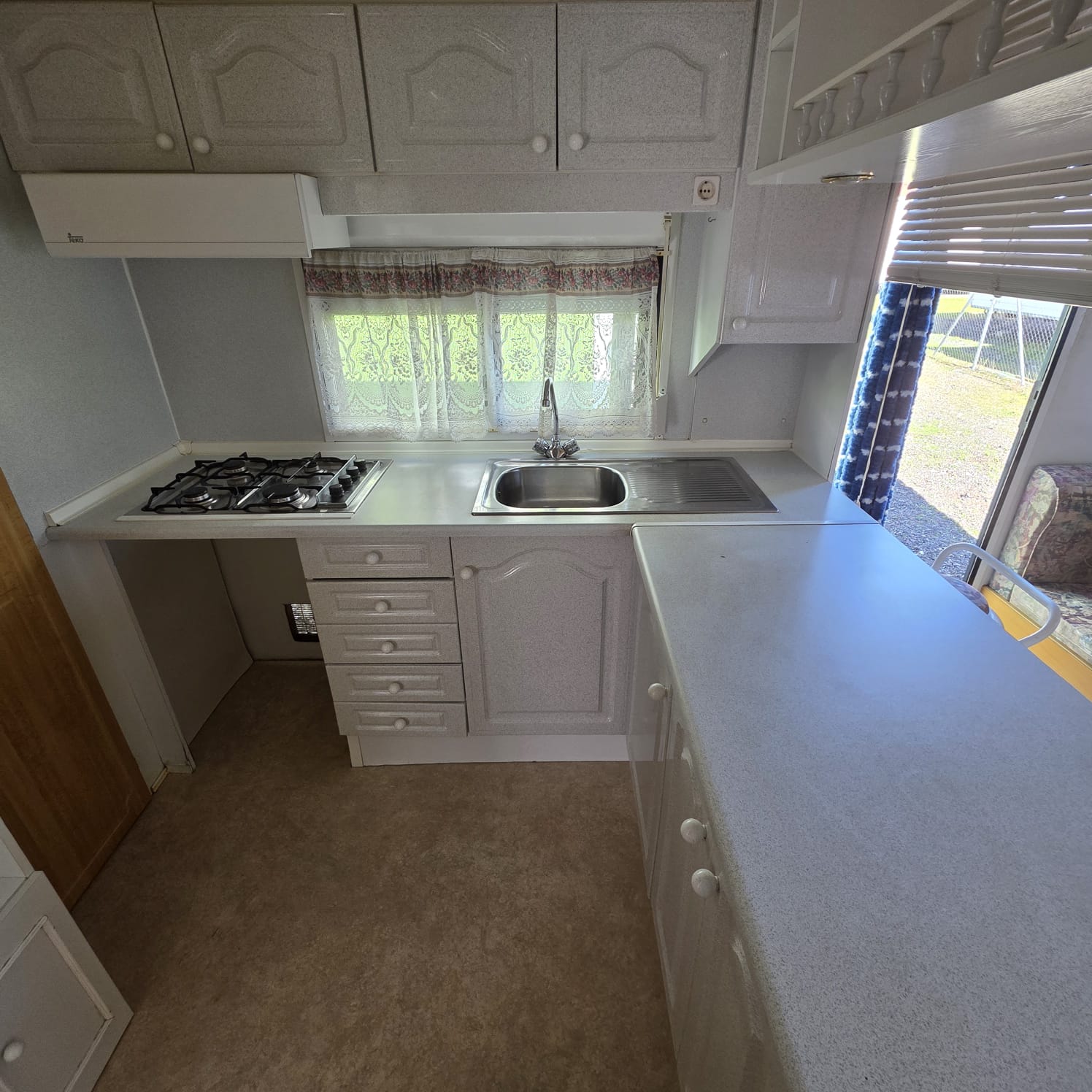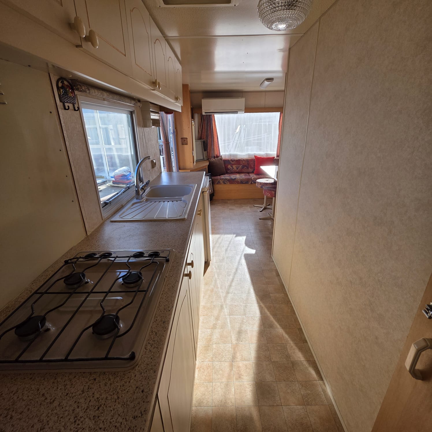 - Cocina en paso con cocina y calentador de gas.